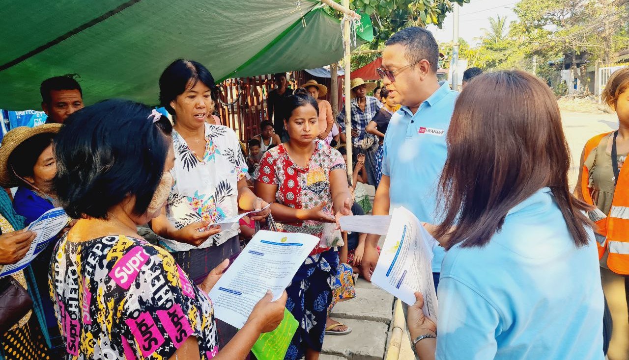 AHF Myanmar team distributes family kits to community members affected by the earthquake. |